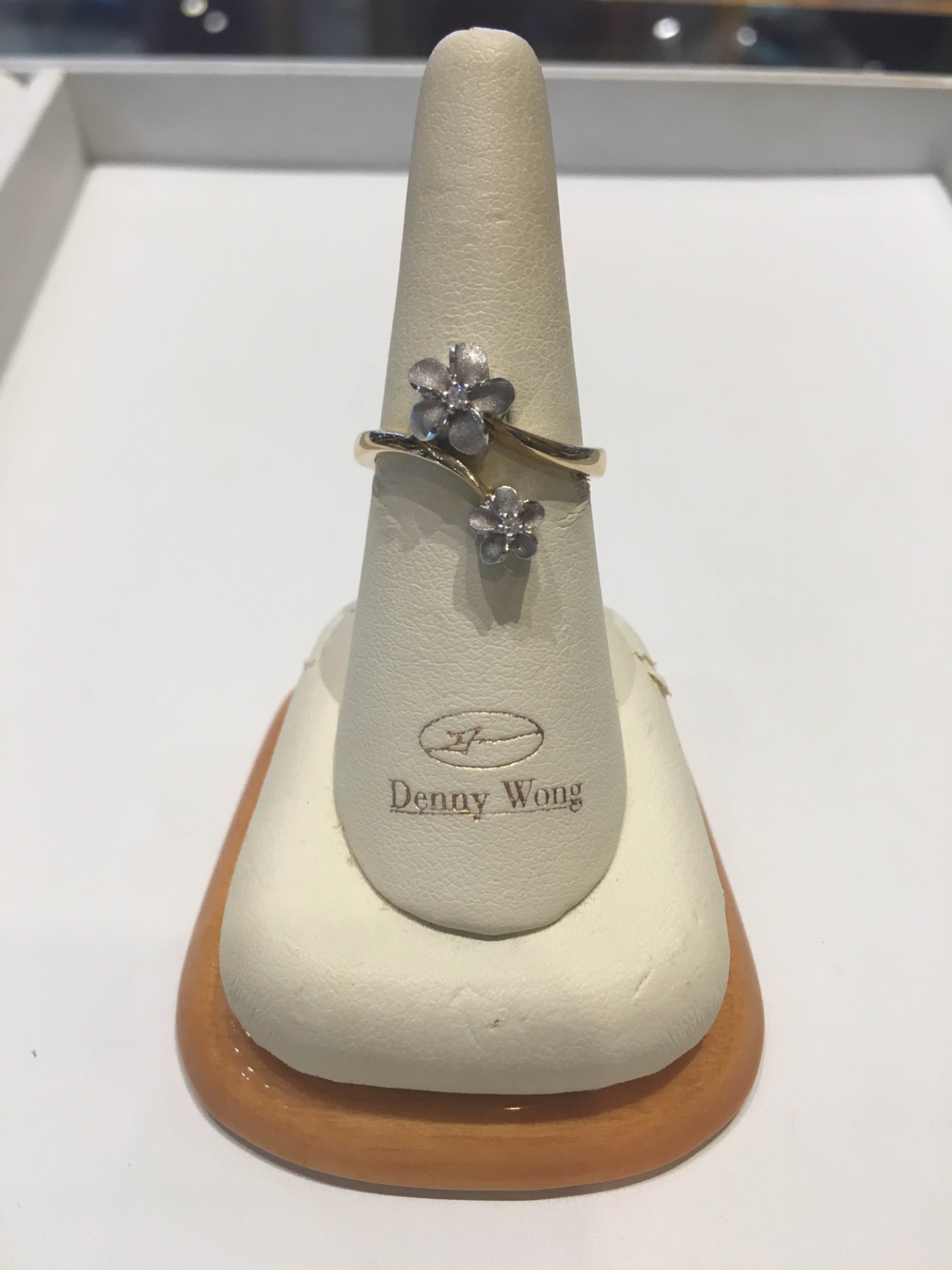 14k Yellow and White Gold 6 & 8mm "Hang 5" Plumeria Ring with 2 Diamonds .03TCW (YG Shank, WG Flowers)-Size 7