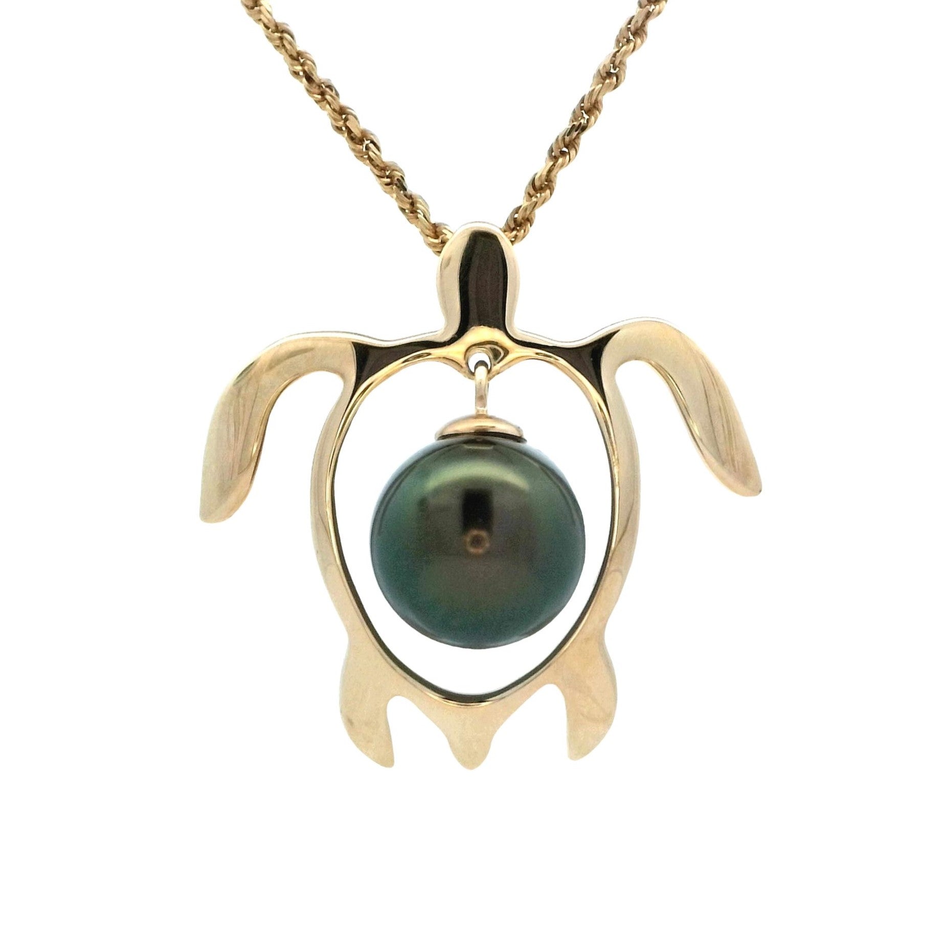 Honu Pendant with Dangling Tahitian Pearl in Yellow Gold