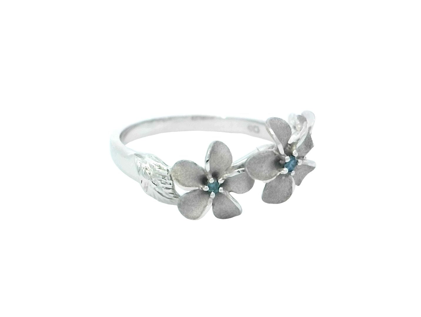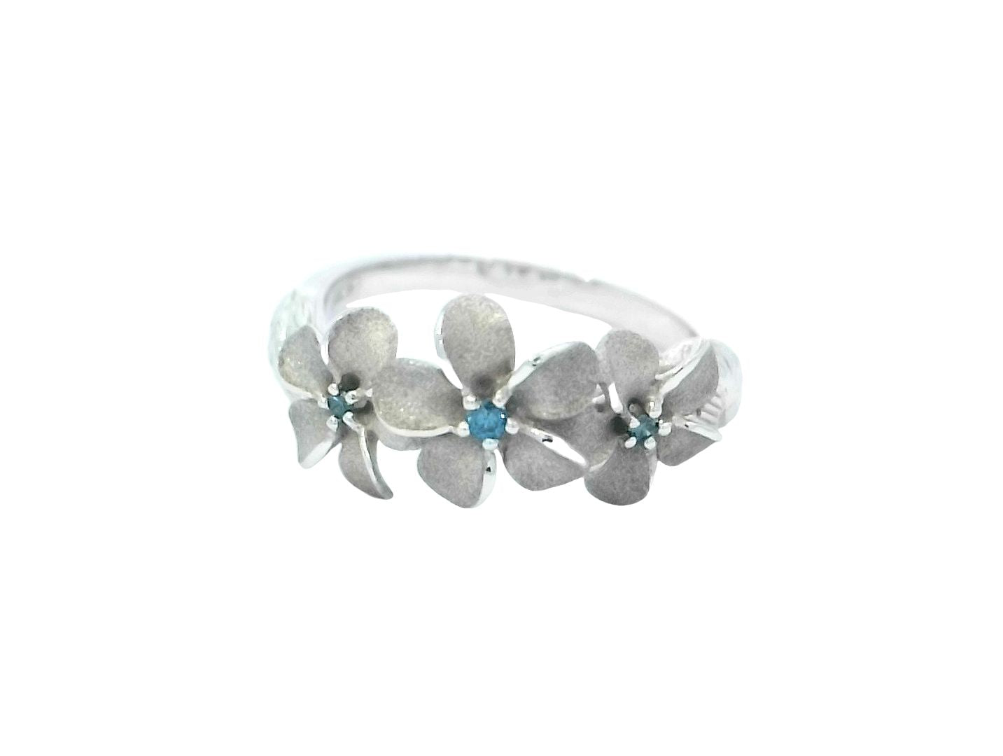 14K White Gold Three Plumeria Flowers Ring with Blue Diamonds, Size 6, Can be ordered in other sizes. Price varies with larger sizes