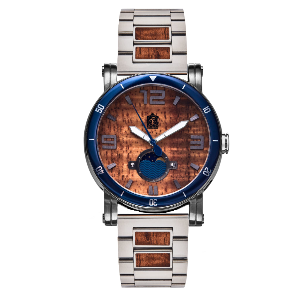Hawaiian Koa watch with 47mm Koa face, Sapphire Crystal, Japanese Moon Phase movement, Stainless Steel body and back, 10 atm, Stainless Steel and Koa band with butterfly clasp, 1 year NO HASSLE warranty from the designer