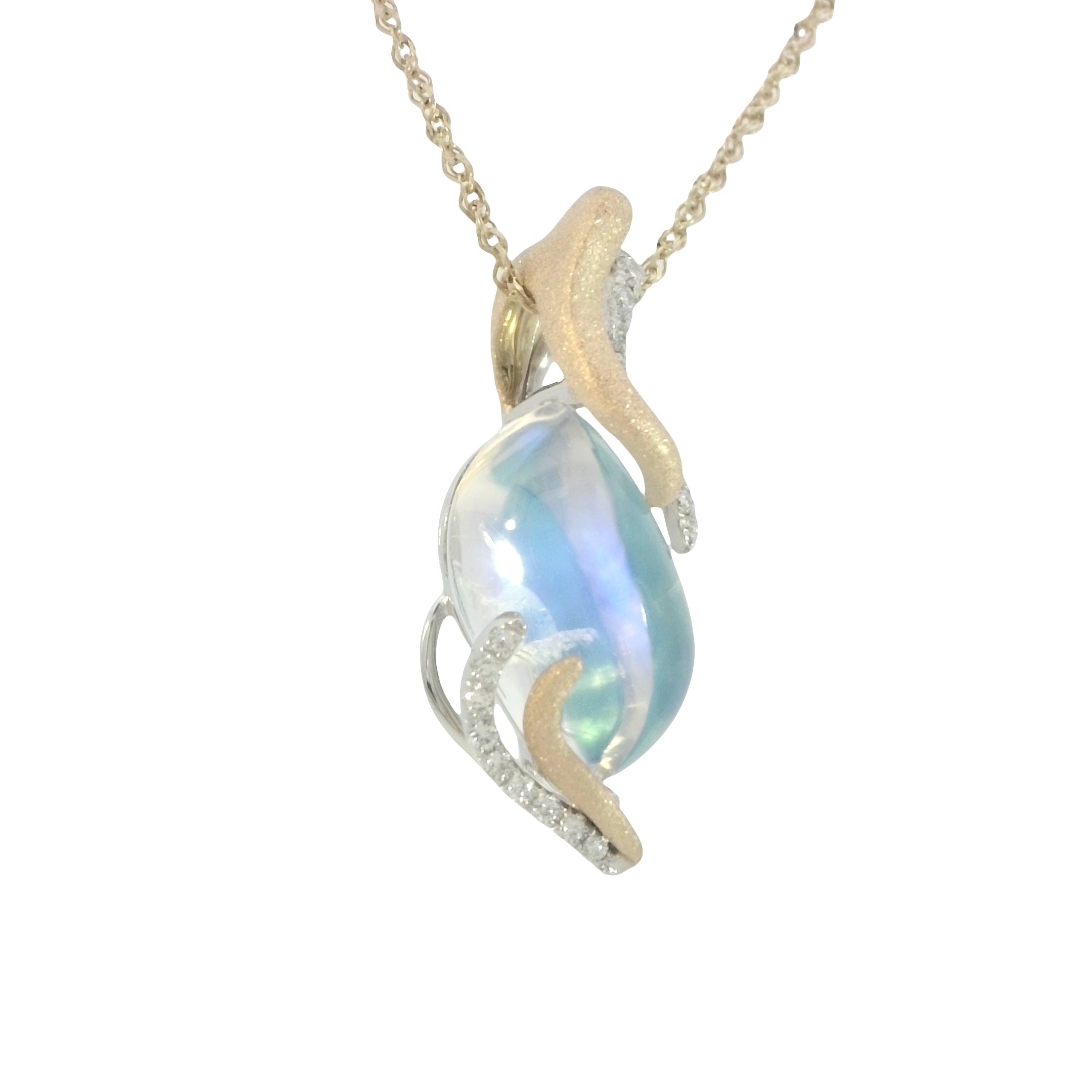 18k Two Tone (Yellow Gold and White Gold) Moonstone Pendant with 19 Diamonds .09ct, Moonstone 4.23 ct, Chain sold separately
