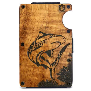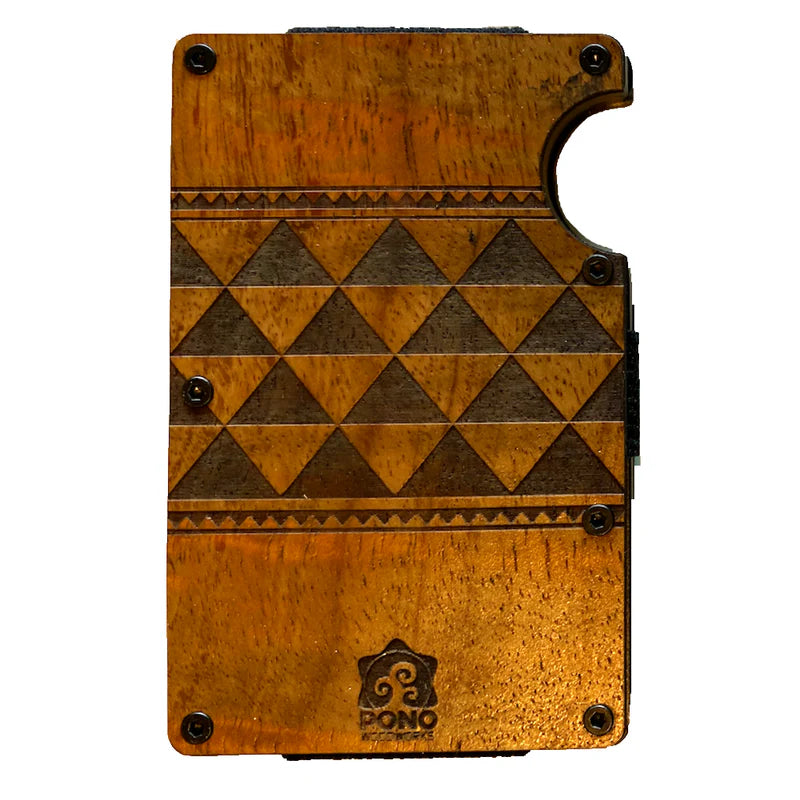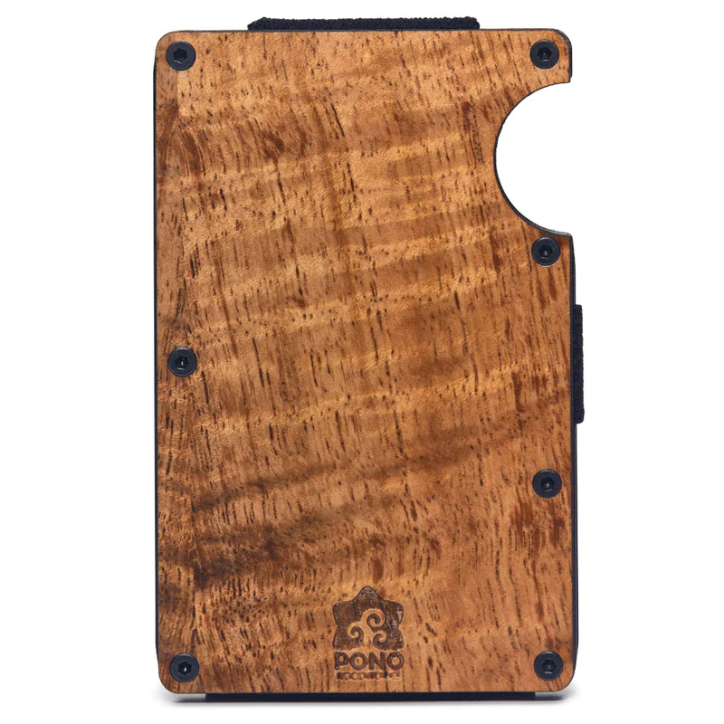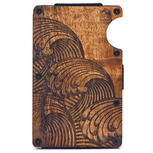 Koa Wood Minimalist Wallet, Elastic, Stretch Sides to accommodate 1-12 Cards, RFID (Identity) Blocking with Carbon Fiber and Money Clip. Available in multiple designs please note your preference in the notes on your order.